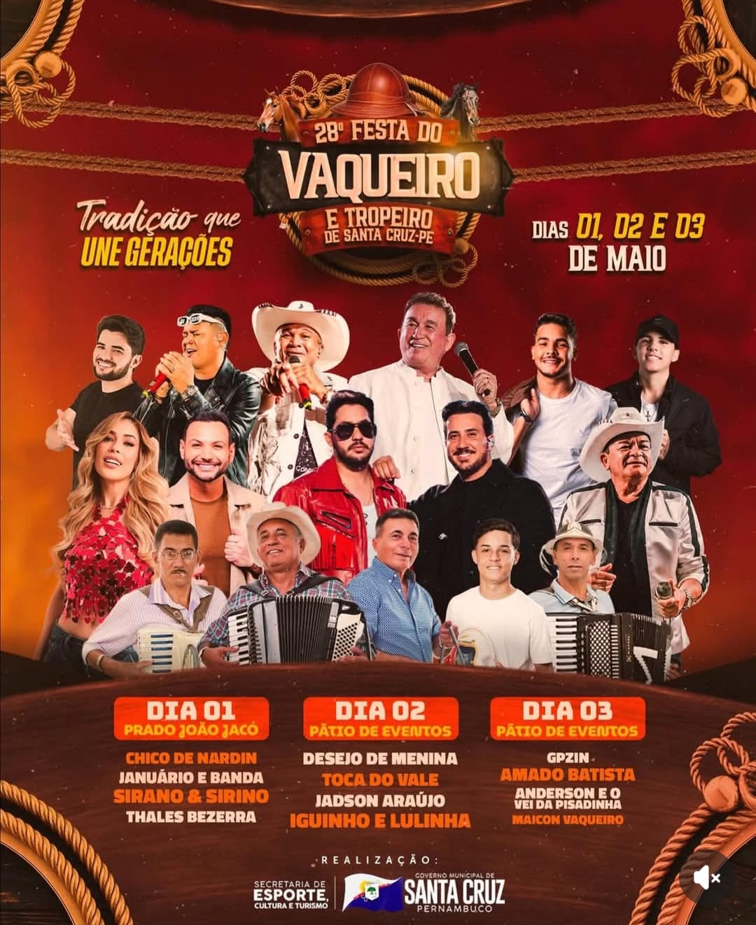 A prefeitura de Santa Cruz, no Sertão de Pernambuco, divulgou a programação da 28ª Festa do Vaqueiro e Tropeiro. O evento reúne competidores e amantes dessa tradição, e conta com corridas de Prado, nas categorias cavalo mestiço, jumento e cavalo raçado.
