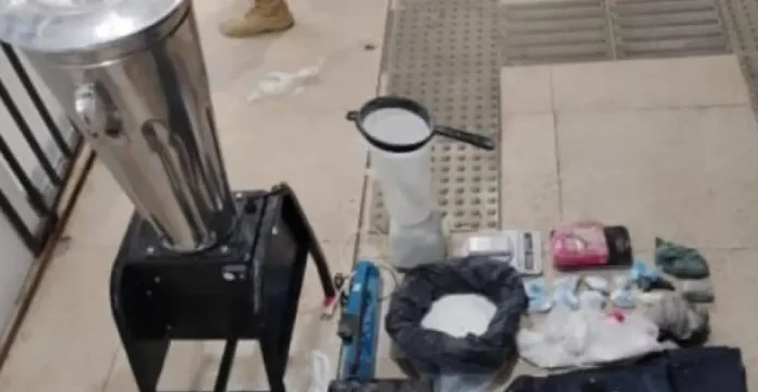 No local, foram encontrados 6kg de drogas entre cocaína e maconha, um colete antibalístico, um selador (equipamento utilizado para selar pacotes contendo drogas), dois liquidificadores, três calças e três blusas militares.