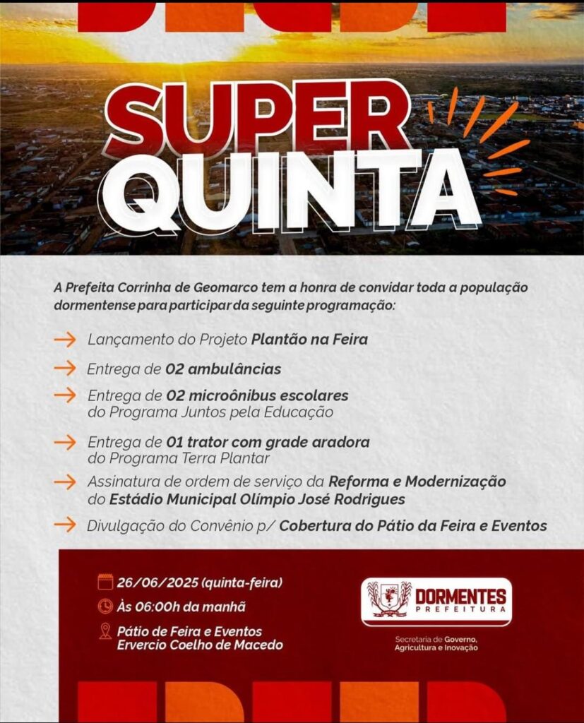 A Prefeitura de Dormentes promove nesta quinta-feira (26) uma série de entregas e lançamentos voltados a diferentes setores do município. A programação da chamada “Super Quinta” começa às 6h da manhã, no Pátio de Feira e Eventos Envercio Coelho de Macedo.