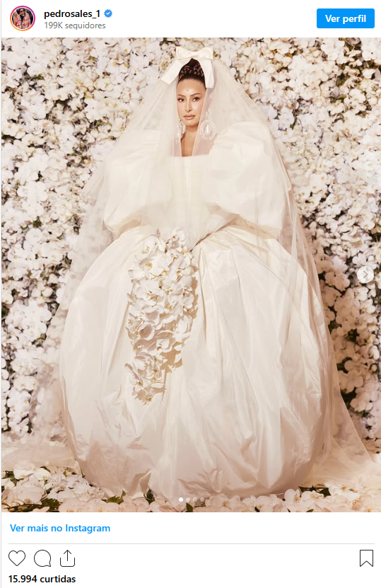 Outras referências que remetiam aos anos 1980, segundo o stylist disse à publicação, estava tafetá, corset, drapeado, mangas dramáticas e laços. Aliás, o laço chama atenção porque aparece como enfeite de cabeça. Pedro disse ainda que o primeiro estilista foi justamente Giambattista Valli, que topou o desafio de criar o vestido, com uma equipe de 10 pessoas em seu ateliê de alta-costura, apenas com as medidas de Sabrina em mãos. Sem tempo de se deslocar até Paris para provar o vestido, a peça foi feita, digamos, “às cegas”.